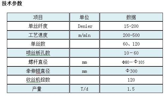 設備用于滌綸、丙綸、錦綸粗旦纖維工業絲的生產,該絲主要用于漁網線、繩索、高密度濾布、頭巾、緍紗、面罩、墊肩、遮陽布等。